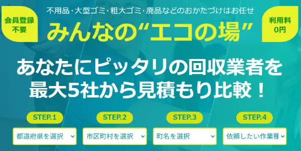 対象外の地域にお住いの方は、あなたにぴったりの回収業者を探せる「エコノバ」で回収業者を探してみてください。「どこの業者が良いか分からない」「相見積りが面倒」と思っている人も、一度の入力で費用目安が分かるので便利です。