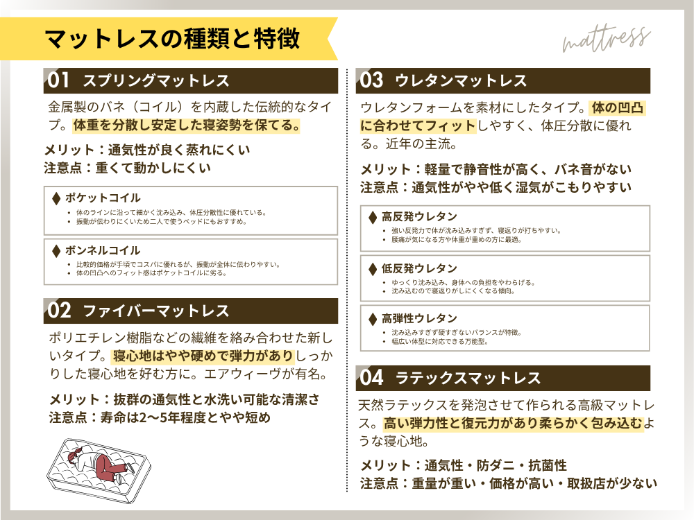 種類 平均寿命 特徴・注意点 スプリング(ポケットコイル等) 約7〜10年 耐久性が高く、へたりにくい。10年以上使える高級モデルもあり。寝心地が変わってきたら交換を。 ウレタンマットレス(高・低反発) 約5〜8年 軽く扱いやすい。低反発はやや短命、高密度タイプなら10年持つものも。凹みが戻らなくなったら替え時。 ファイバーマットレス 約2〜4年 通気性抜群で衛生的だが、繊維の潰れで寿命は短め。定期洗浄で多少延命可。 ラテックスマットレス 約10〜15年 天然素材で耐久性に優れる。経年で硬化・劣化したら買い替えを。 ポイント: