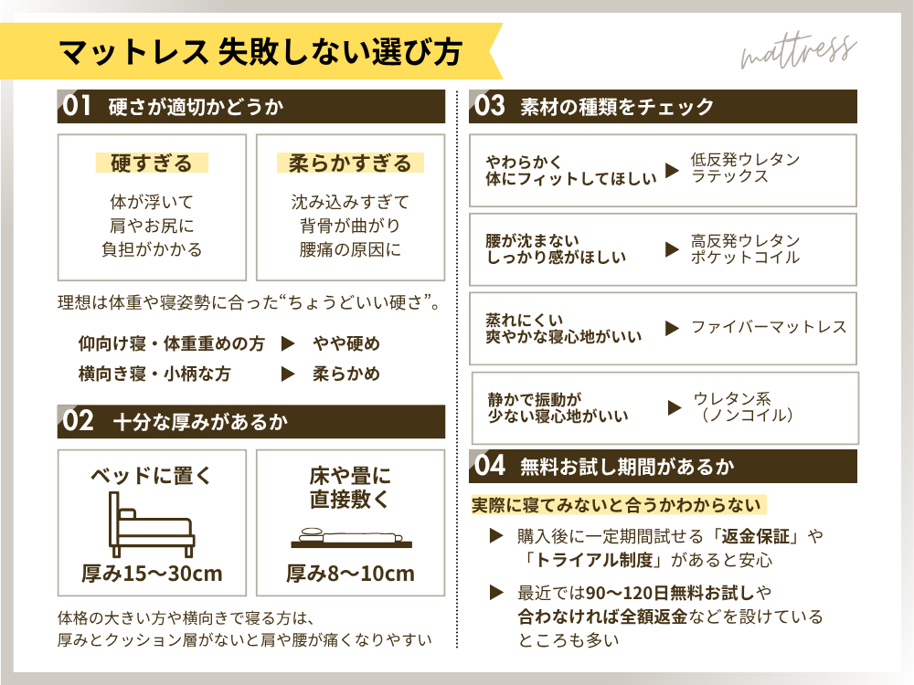 つまり、選び方の正解は人それぞれ。「予算重視」「体へのフィット感重視」「失敗しない保証重視」など、自分の優先順位を明確にすることが、後悔しないマットレス選びの第一歩です。